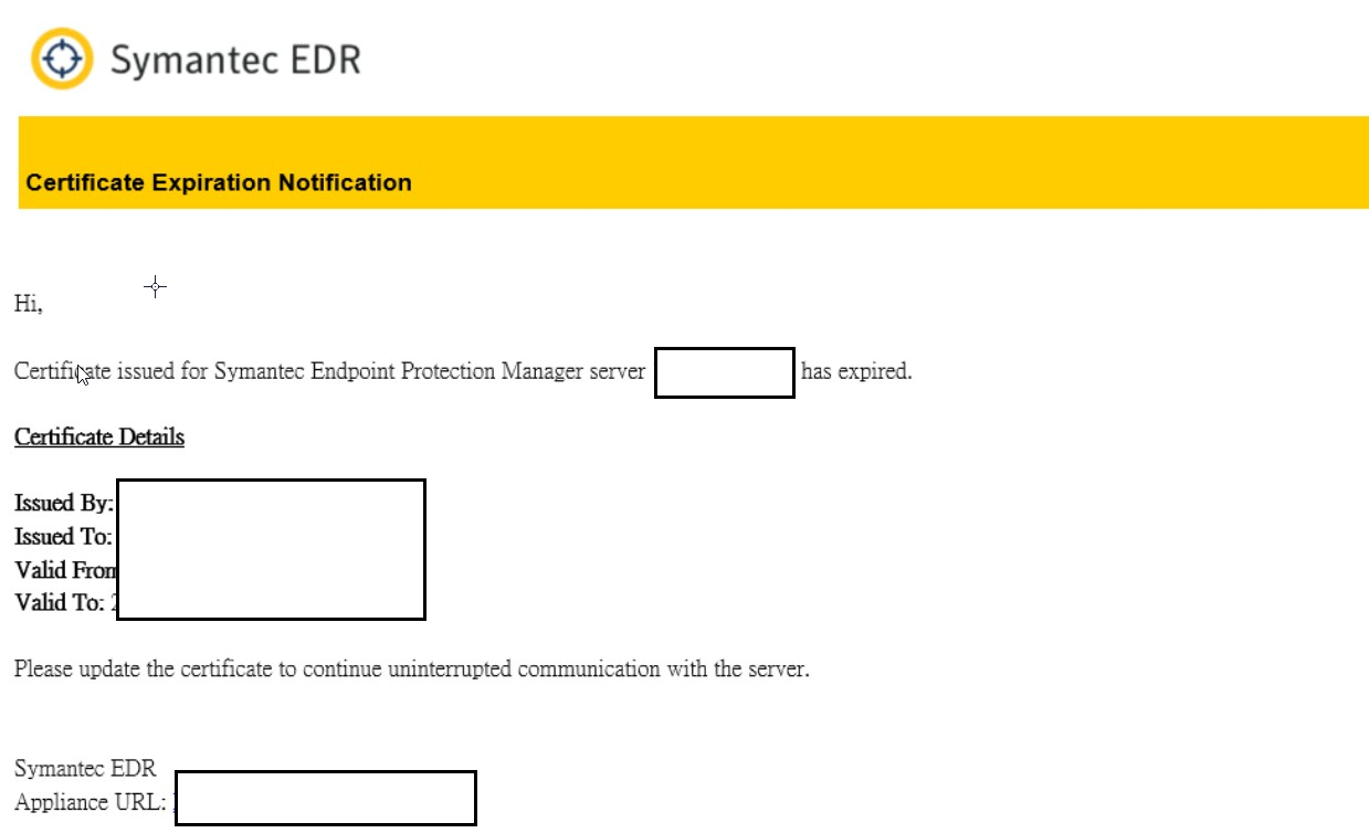 You may see a system health alert for an expired Symantec Endpoint Protection Manager (SEPM) certificate, even if the host or IP the certificate is for is no longer configured on the SEDR appliance.