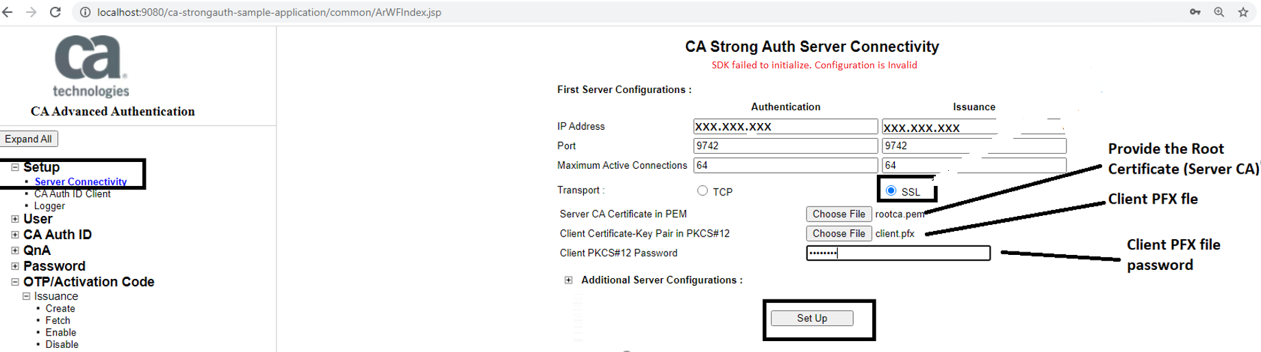 1. Set up of Sample Application for SSL fails with error "SDK failed to initialize. Configuration is invalid" as shown below in Screen Shot #1