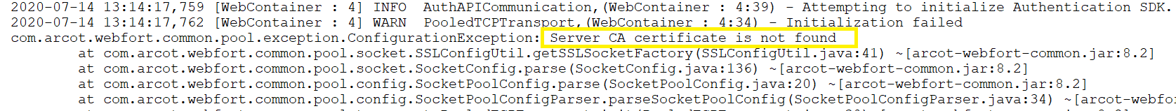 The Webfort Sample Application program requires that the environment variable ARCOT_HOME be set to a location where it can save the above provided SSL certificates. If the ARCOT_HOME variable is not set or not visible to the Webfort Sample Application (ca-strongauth-sample-application) then this issue will occur.