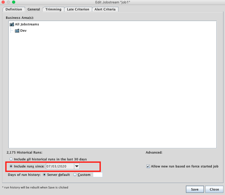The jobstream run history can be rebuilt by selecting a date in the past from the Admin > Edit Jobstream > General tab and selecting Save.