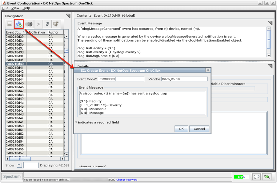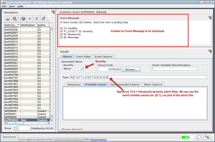 We will start by generating a new event ID to be generated when the following syslog is sent to Spectrum %SFF8472-3-THRESHOLD_VIOLATION.