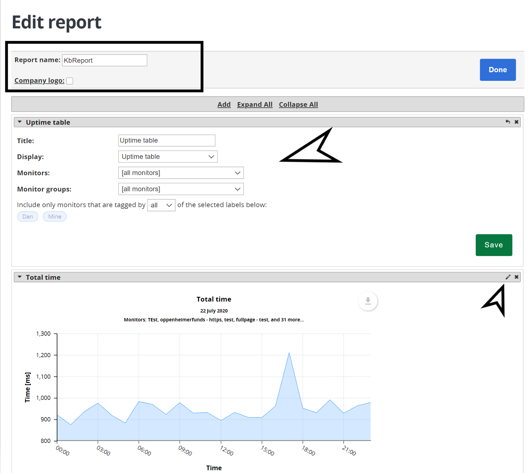 4) Give a name to your report, by clicking in a pencil as below you can manage your report to add what monitor you want to receive:
