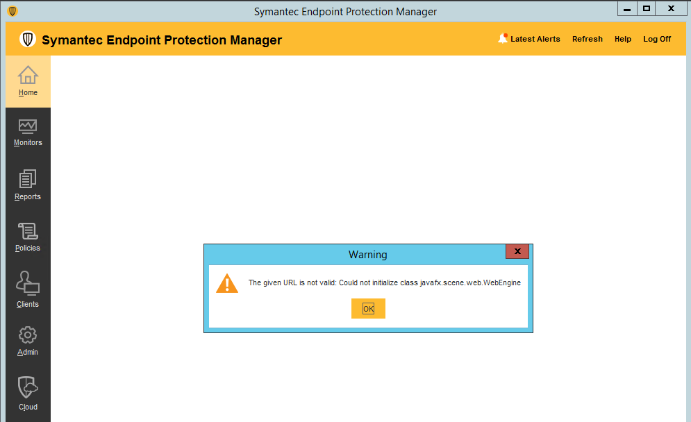 Now you try to log on SEPM console, you get following error and right pane of SEPM console becomes blank.