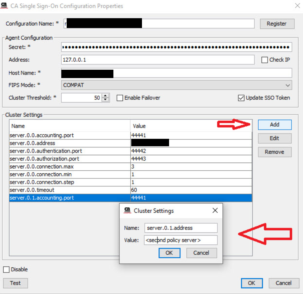How to configure 1 cluster with 2 policy server in APIM policy manager - from the Manage SSO Configurations https://techdocs.broadcom.com/us/en/ca-enterprise-software/layer7-api-management/api-gateway/11-0/security-configuration-in-policy-manager/tasks-menu-security-options/manage-ca-single-sign-on-configurations/ca-single-sign-on-configuration-properties.html#concept.dita_1461ee9079a4fb216399f7820c4963f00f9e5e9e_clustersettings