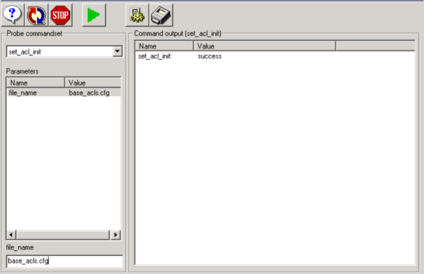 4. In the probe commandset, select callback set_acl_init with the parameter value "base_acls.cfg". The callback updates the security.cfg with the ACLs, it will not delete any ACLs, nor change any ACLs.