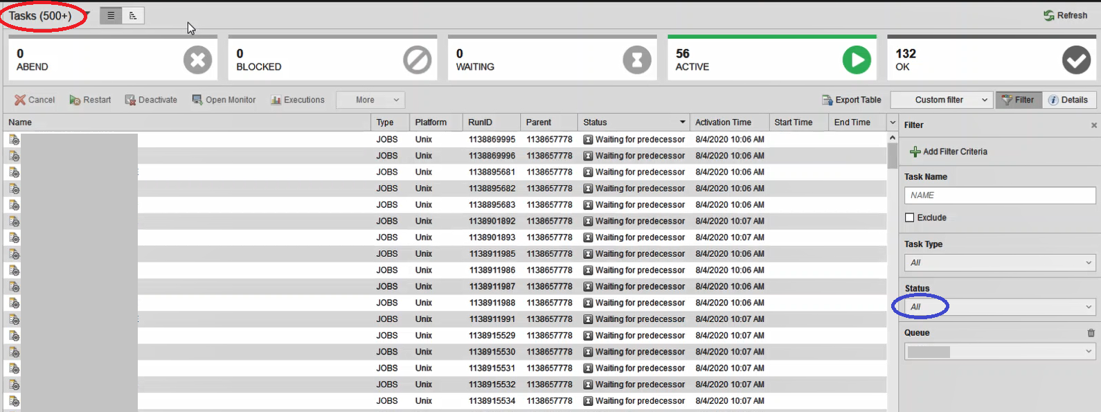 2.- Some status are not shown in the initial status count because they are not part of the 500 most recent objects. On the screenshot, the 2 ABEND objects are older, so they are not shown under the first 500.