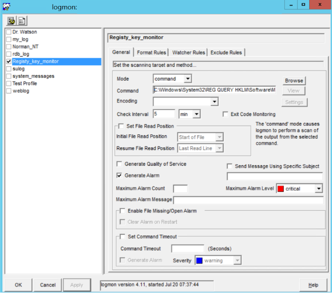 Note: A point need to mention here is that the user used by the probe must have the right to make a call using 'reg' command. If not so, assign the local user and its password with the rights in logmon probe configuration->setup