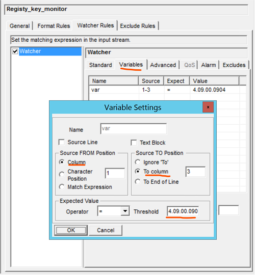 8) In variable window specify a variable threshold, in 'Expected Value' section , select operator '=' 'current_value', which is the value you expect it to be.