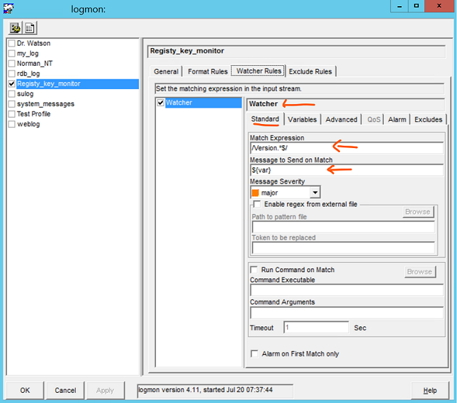 5) In watcher rules -> Standard tab, use regular expression as such : /Version.*$/ and specify error message and alarm severity