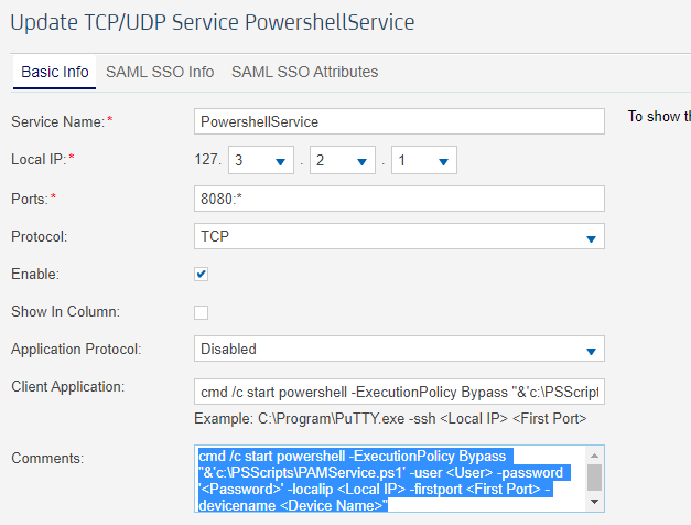 We are interested in configuring a service that launches a powershell script in PAM, passing in the parameters that are available in TCP/UDP service definitions, such as <Local IP> and <First Port>. We found forum post https://community.broadcom.com/communities/community-home/digestviewer/viewthread?MID=803467#bm4b812c70-bc62-4762-90a1-374642296bf6, but this didn't provide enough information for us to get a service working.