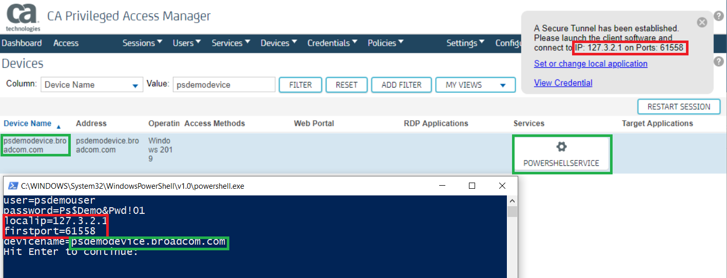 If you add code in the PS script to make a network connection to <Local IP>:<First Port> (here 127.3.2.1:61558), PAM will route this connection to port 8080 on device psdemodevice.broadcom.com.