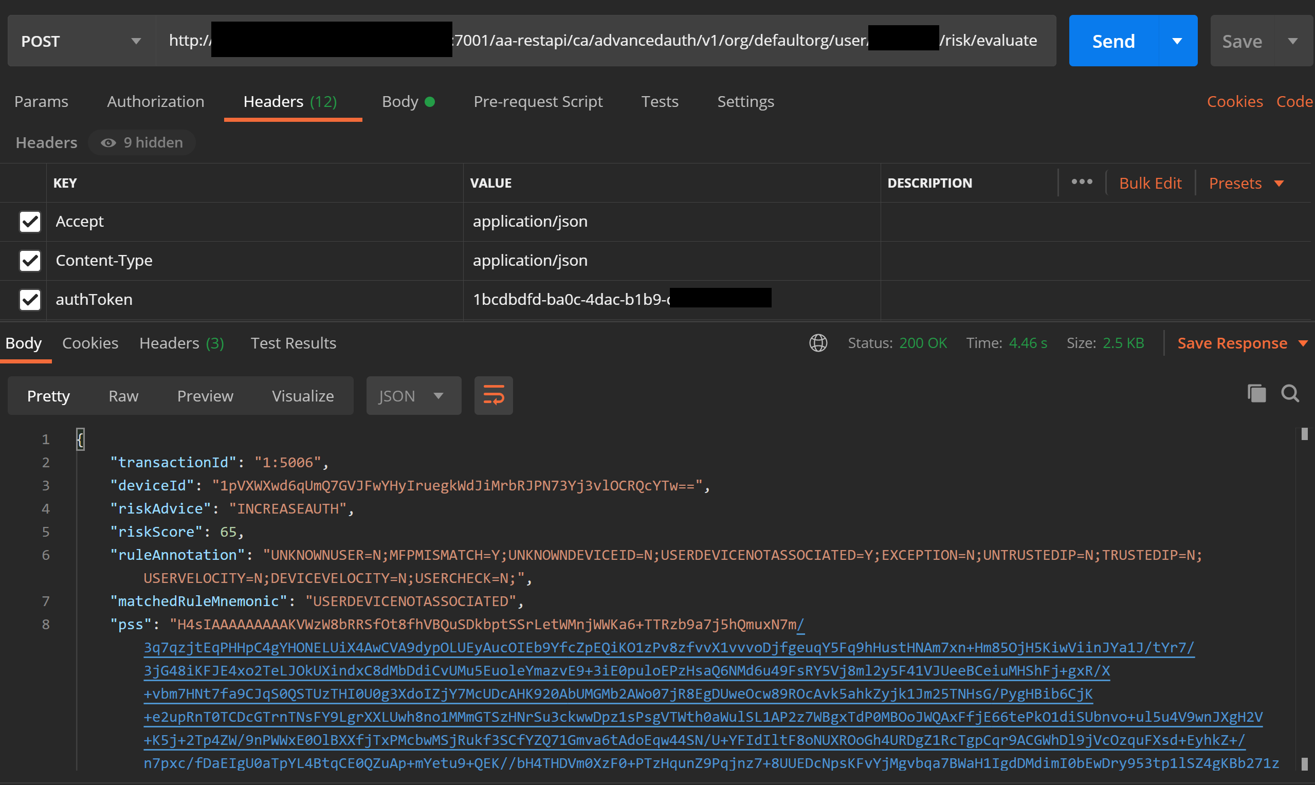 Please provide a sample request and response for Risk Evaluation and Post Evaluation Rest API's.