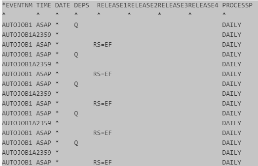 If some jobs are left pending at the end of the day then use an abort time of 23:59. For example, to define 5 jobs named AUTOJOB1 with the Q dependency and using a resource named EF: