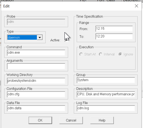 The following example shows the cdm probe configured to run only 5 minutes per day, from 12:15 to 12:20pm: