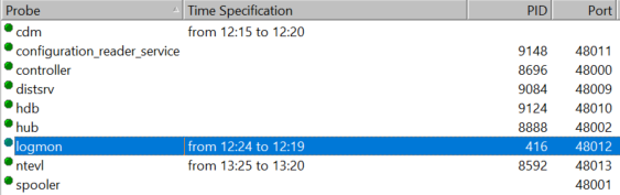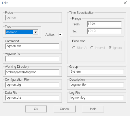 The following example shows the logmon probe configured NOT to run for 5 minutes per day: Each day at 12:19pm, it shuts down for 5 minutes, starting up again at 12:24pm.