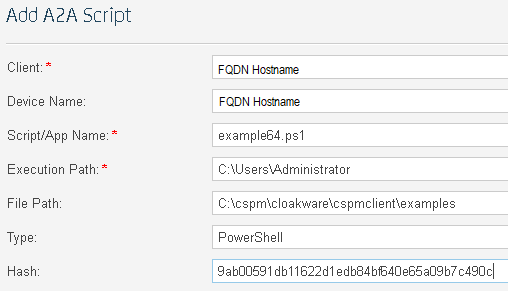 | Target alias: <user@FQDN> Script name: example64.ps1 Script path: Script Location: C:\cspm\cloackware\cspmclient\examples Script hash: The hash value, this changes based on the script |