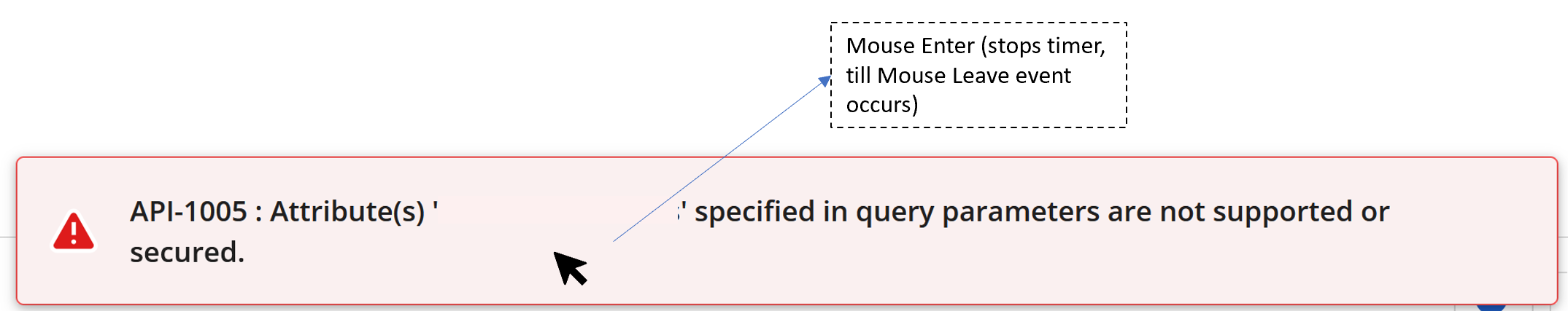 The duration for which the error popup message is shown is sufficient to let user perform an event i.e. Mouse Enter(mouse pointer moved into an element) on error popup, which pause the timer, until Mouse Leave event happens the error popup remains on the screen providing viability for user to read. Please refer screen shot below