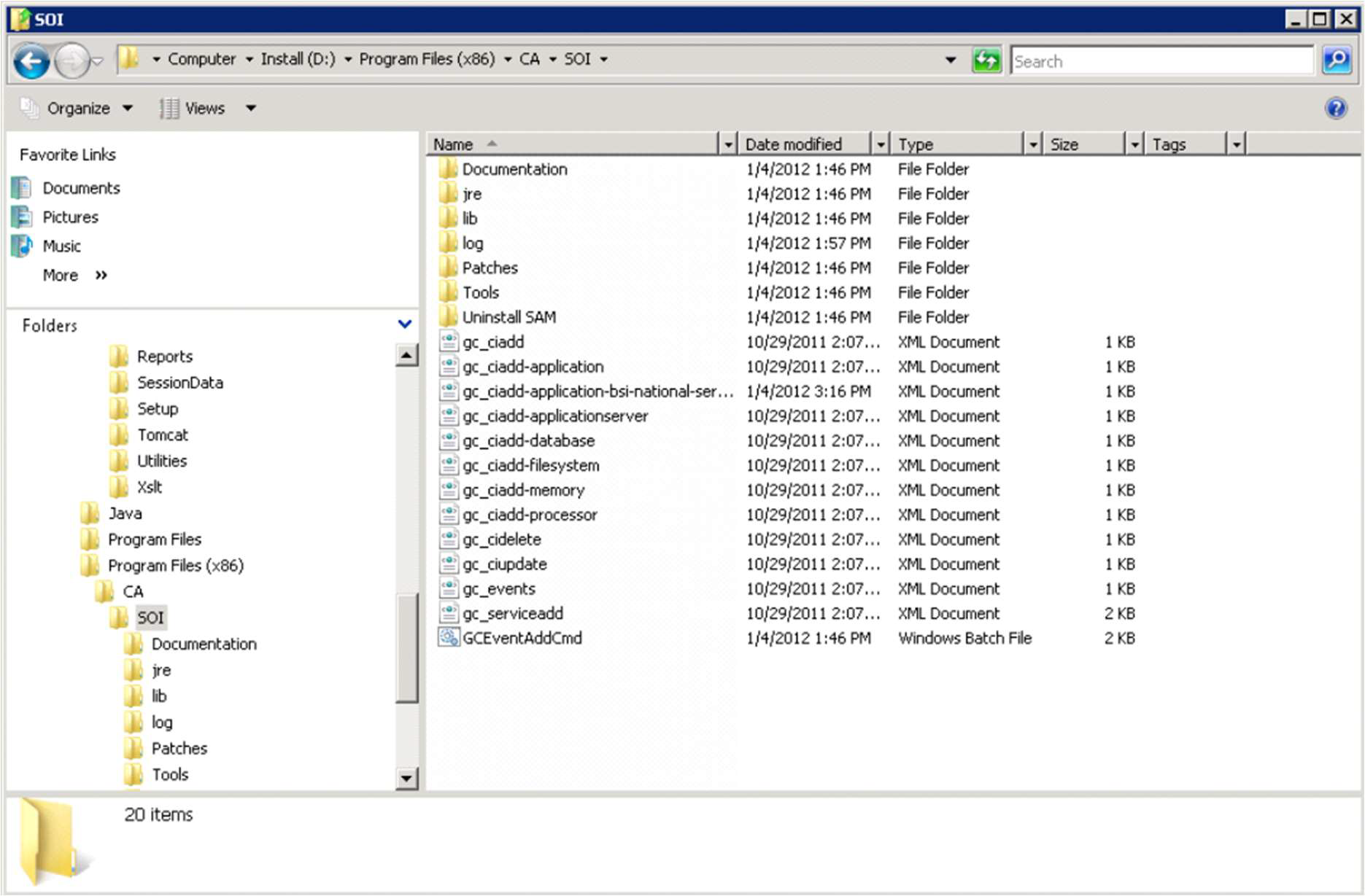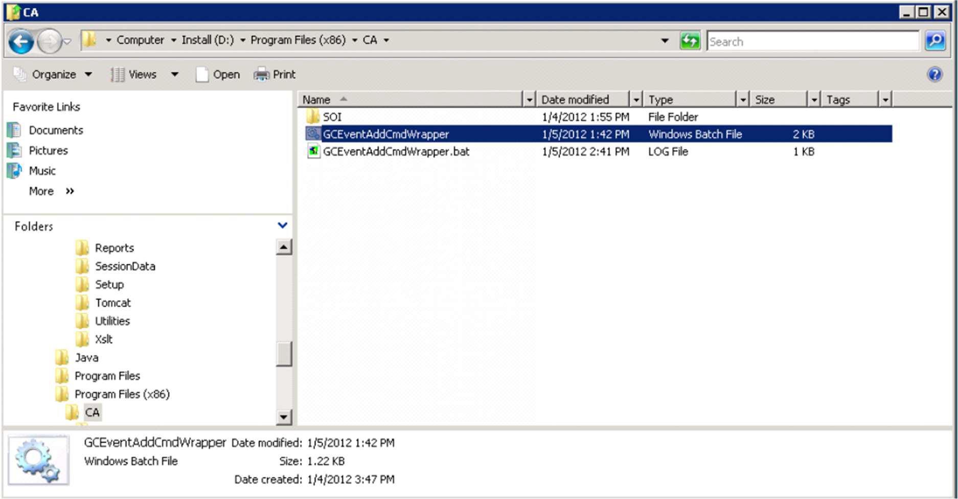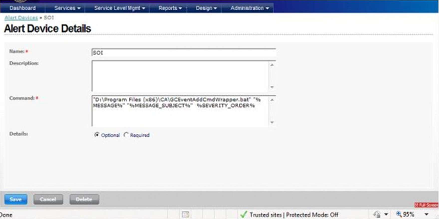 @echo offsetlocalset COMMAND=SOI\GCEventAddCmd.batset CA_HOME="D:\Program Files (x86)\CA\"set SOI_HOST=<IP Address of SOI host>set SOI_PORT=7090set DEVICE=CA_BSIset DEFAULT_APP=SA_Applicationset CLASS_NAME=Applicationset TYPE=Qualityrem the following procedure is used to get a timestamp in the form of YYYYMMDDHHMMSSCCwhich will be used for bothrem logging and as the *unique alert id.for /f "skip=1 tokens=2-4 delims=(-)" %%a in ('"echo.|date"') do (for /f "tokens=1-3 delims=/.- " %%A in ("%date:* =%") do (set %%a=%%A&set %%b=%%B&set %%c=%%C))set /a "yy=10000%yy% %%10000,mm=100%mm% %% 100,dd=100%dd% %%100"for /f "tokens=1-4 delims=:. " %%A in ("%time: =0%") do @setUNIQUE=%yy%%mm%%dd%%%A%%B%%C%%Drem parse the arguments passed to this script to determine the correct CI for SOIfor /f "tokens=1,2 delims=:" %%a in ("%~1") do set service=%%a&set message=%%becho %UNIQUE% %CA_HOME%%COMMAND% -h%SOI_HOST%:%SOI_PORT% -a%UNIQUE% -i"%DEFAULT_APP%:%service%" -c%CLASS_NAME% -d%DEVICE% -s%3 -t%TYPE% -m"%~2%message%" >> %0.log%CA_HOME%%COMMAND% -h%SOI_HOST%:%SOI_PORT% -a%UNIQUE% -i"%DEFAULT_APP%:%service%" -c%CLASS_NAME% -d%DEVICE% -s%3 -t%TYPE% -m"%~2%message%"echo Return code: %ERRORLEVEL%