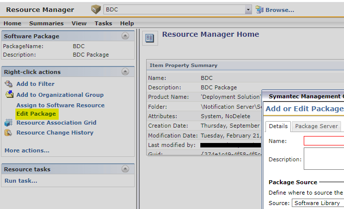 b) For package that you may already have - in the SMP Console go to Manage > All Resources > Default > All Resources > Package > Software Package and select your package. Double-click (or right-click > Resource Manager). Under "Right-click Actions" section, click on "Edit" Package. Edit the package and add a dummy text file to it: