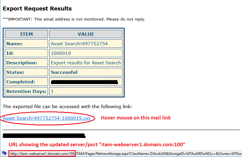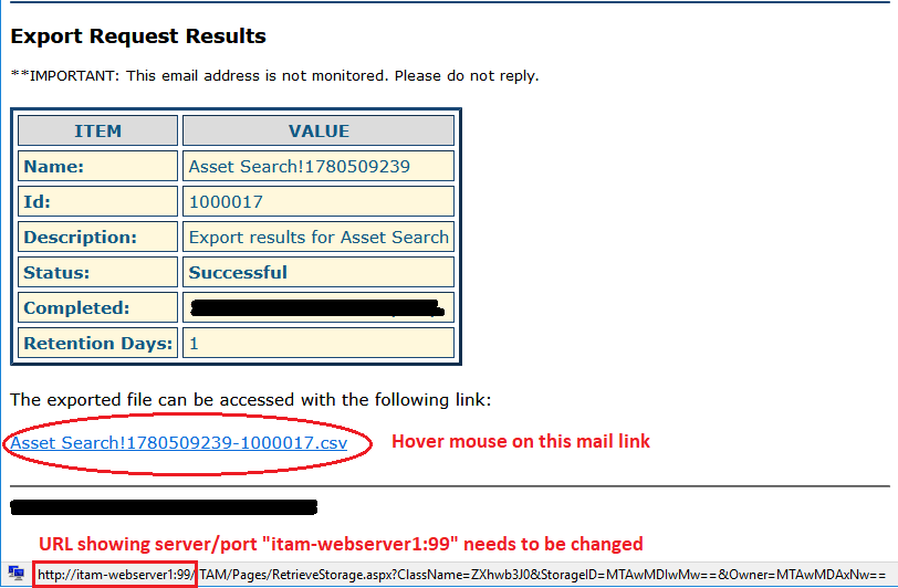 update al_cdb_configurationparameters set configvalue = 'ITAM-WEBSERVER1.DOMAIN.COM' where configkey = 'LoadBalancerName' and componentkey = 'Web_Server'The above changes will modify the host name and port number of the Web Server that the Data Exporter is using to define the URL to provide to a given end user running an export.