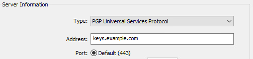 The Symantec Encryption Server entry in the Encryption Desktop Keyservers list has a type of PGP Universal Services Protocol. It connects to Encryption Management Server over port 443. Keys cannot be uploaded using this connection, even if the Universal Services Protocol is enabled in Encryption Management Server: