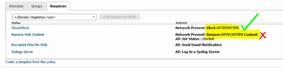 There are 2 response rules being entered in the policy configuration - one to Block HTTP Content and a second one to Remove HTTP content.