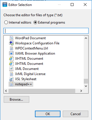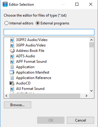 With the file extension highlighted in the "File types" list, click the "Add" button next to the lower "Associated editors" list. Select the "External programs" radio button, and click the "Browse" button