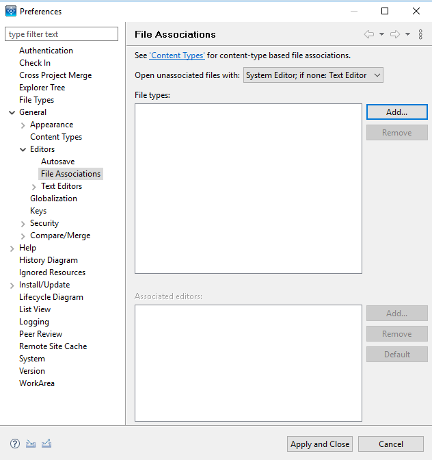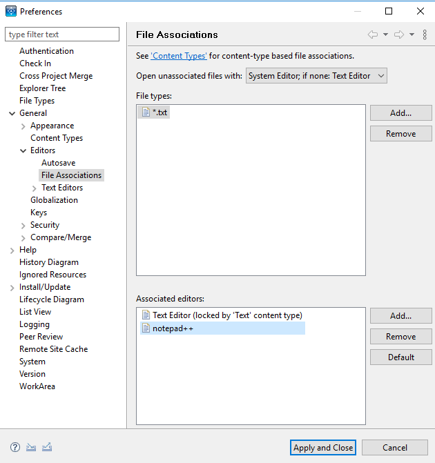 Back on the "File Associations" screen, with your desired application selected in the "Associated editors" list, click the "Default" button. Finish by clicking the "Apply and Close" button.