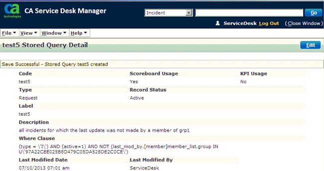 An example of a stored query that shows all incidents for which the last update was NOT made by a member of a particular group is as follows: