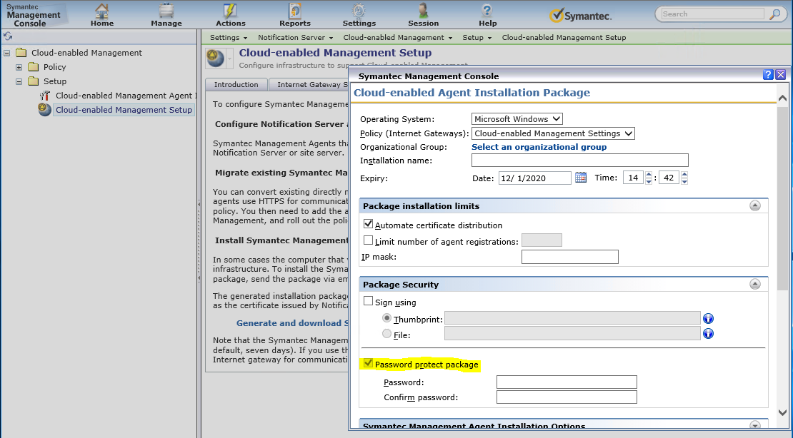 The option "Password protect package" is checked and greyed out and it cannot be unchecked.