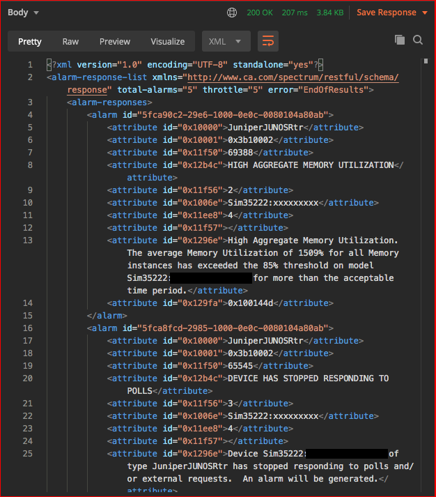 <? xml version = "1.0" encoding = "UTF-8" standalone = "yes" ?> < alarm-response-list xmlns = "http://www.ca.com/spectrum/restful/schema/response" total-alarms = "0" throttle = "0" error = "EndOfResults" > < alarm-responses/ > </ alarm-response-list > Even Though Alarms are present on the Device