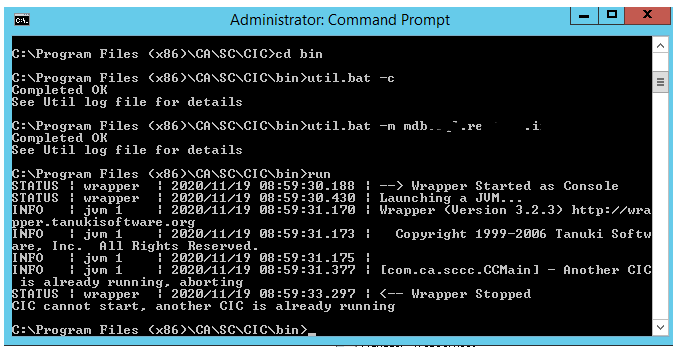 INFO | jvm 1 | 2020/11/24 09:44:29 | [com.ca.sccc.CCMain] - Another CIC is already running, aborting