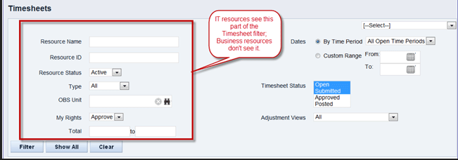 Other business users (not in the IT group) do not see the additional fields in the filter section and when filtering for a Custom Range for past dates, do not see past Timesheets for 'Closed' Time Reporting periods. They are able to see past Timesheets if the Time Reporting period is still 'Open'.