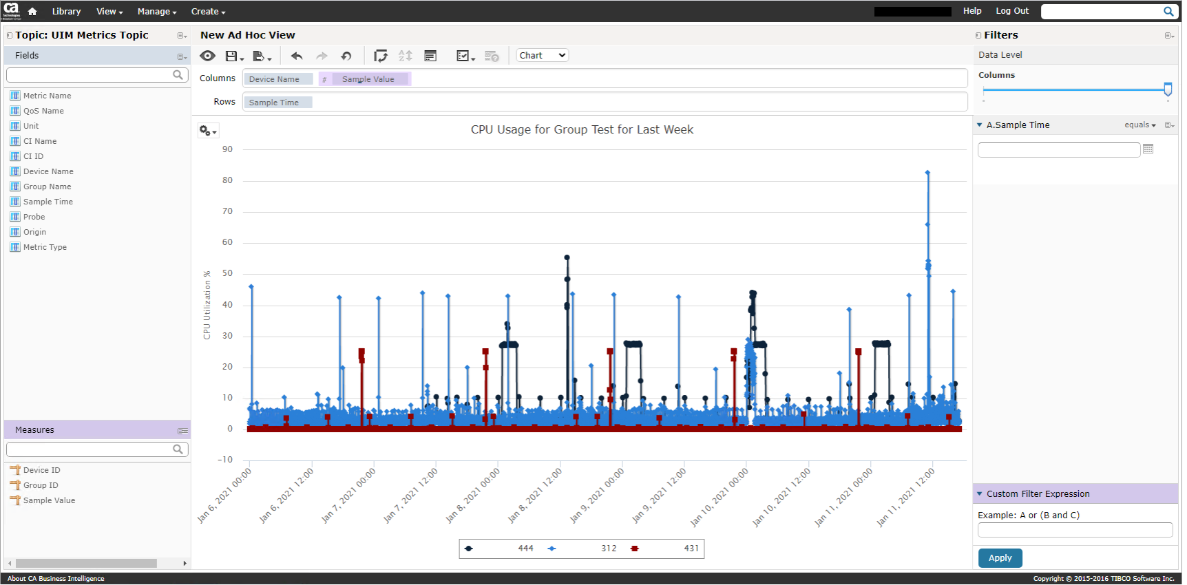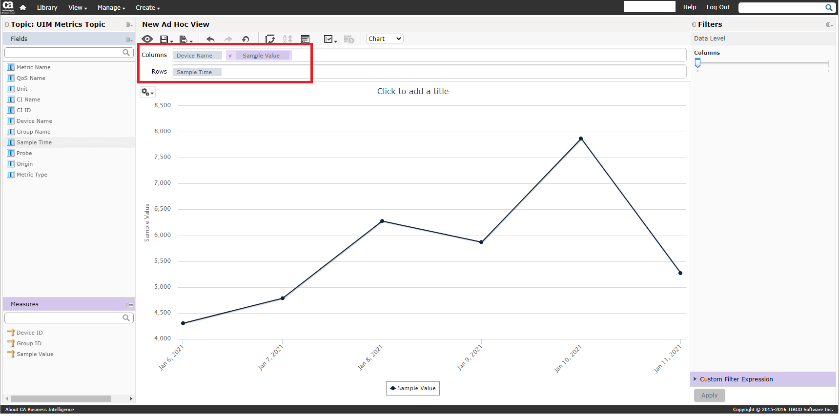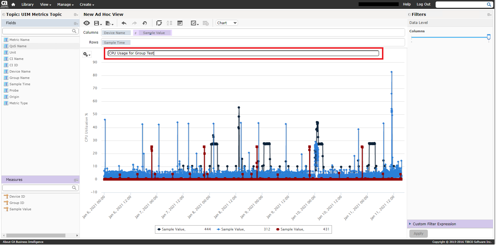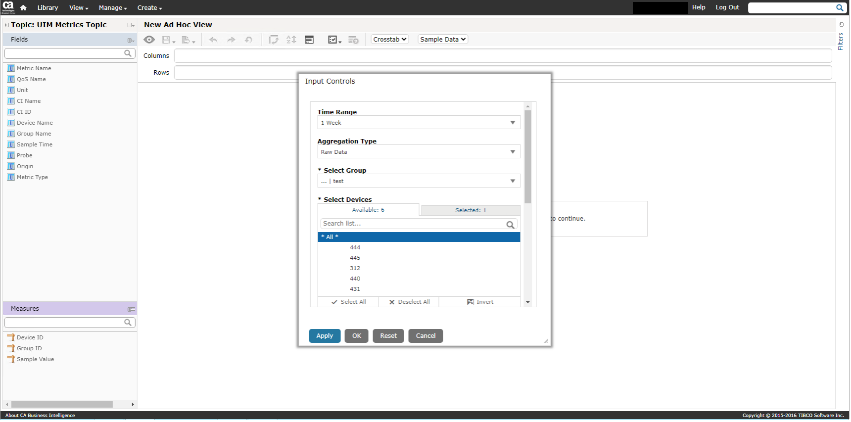 This is an example of the creation of a simple Ad Hoc report that will display a single QOS metric for a group of devices for a period greater than 1 hour and that allows for a raw data aggregation.