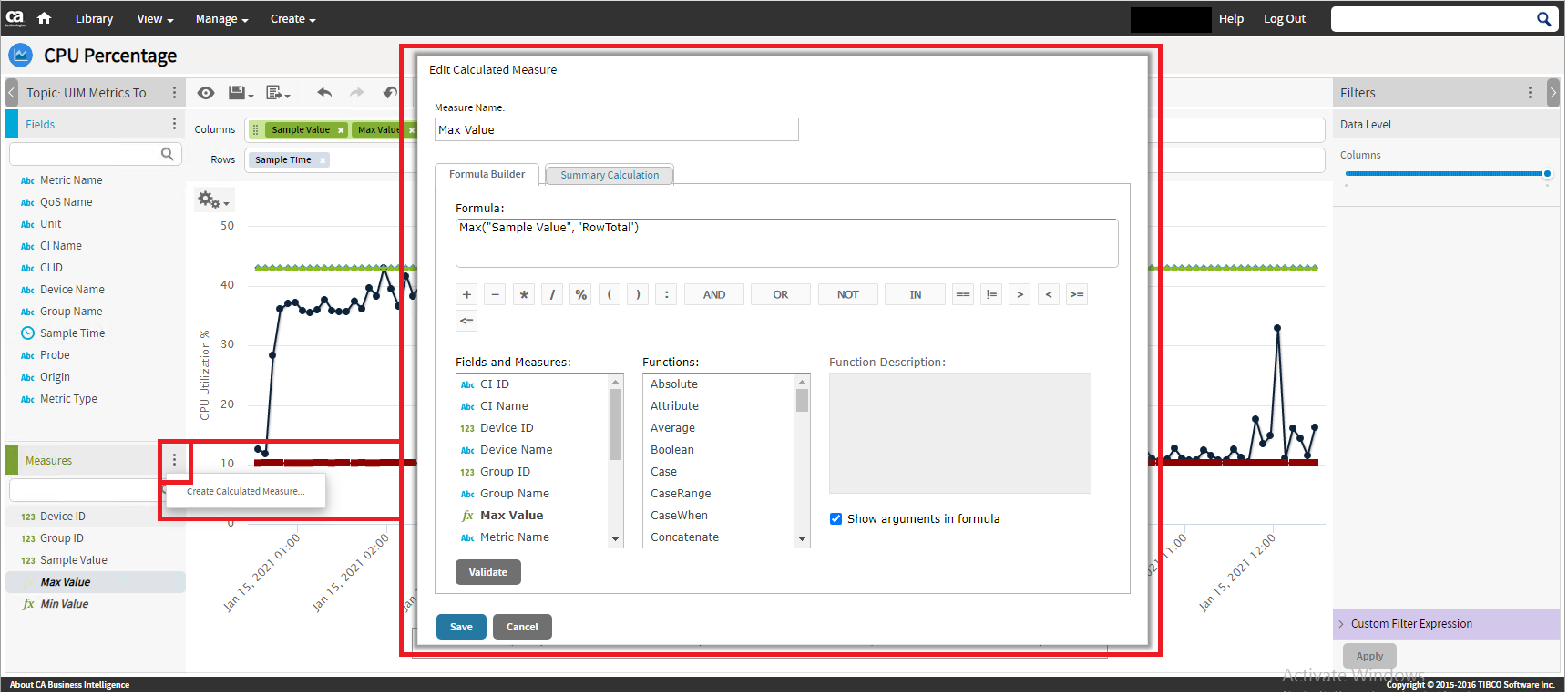 Also I can create measures of min and max of the sample values if I want to see that listed: