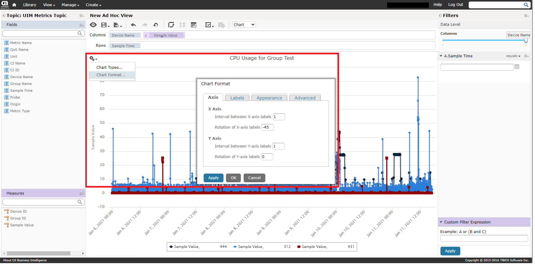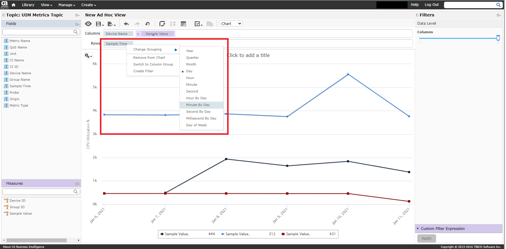 Right click on Sample Time > Change Grouping > set to desired sample points (generally the same on all versions). This is generally going to be set to 'Minute By Day' to eliminate miscalculations of given points: