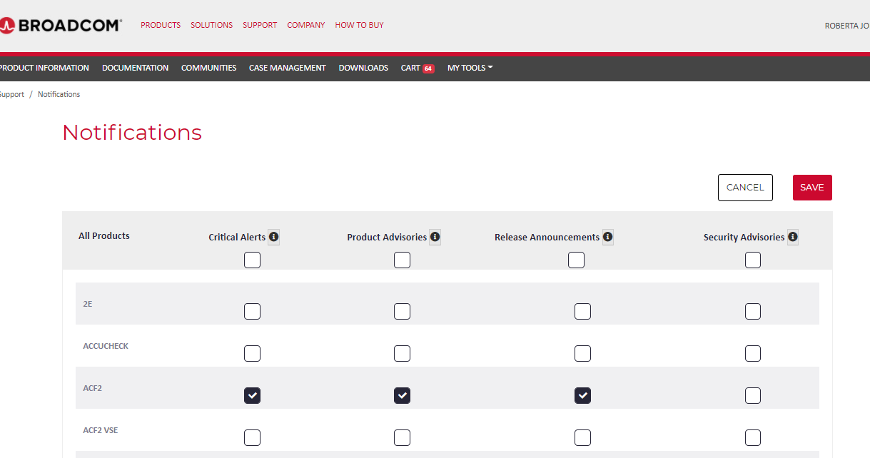 Each User can set up the notification that they want to recieve via the support portal - support.broadcom.com