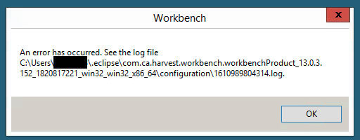 Locate Workbench's config.ini file in folder %CA_SCM_HOME%\configuration folder and view this file in Notepad. Look for the option "eclipse.application=". If you don't see anything after the equals sign (=) that is what is causing the error message.