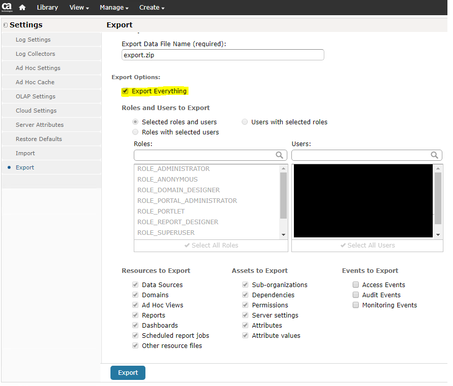4. Select "Export" and this will export ALL Jasper Report Server Customization.