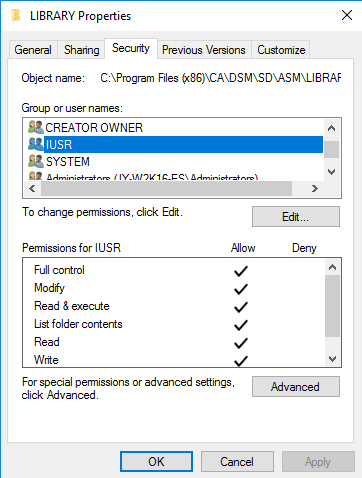5- On Windows folder C:\Program Files (x86)\CA\DSM\SD\ASM\LIBRARY add user IUSR in Security with Full Control