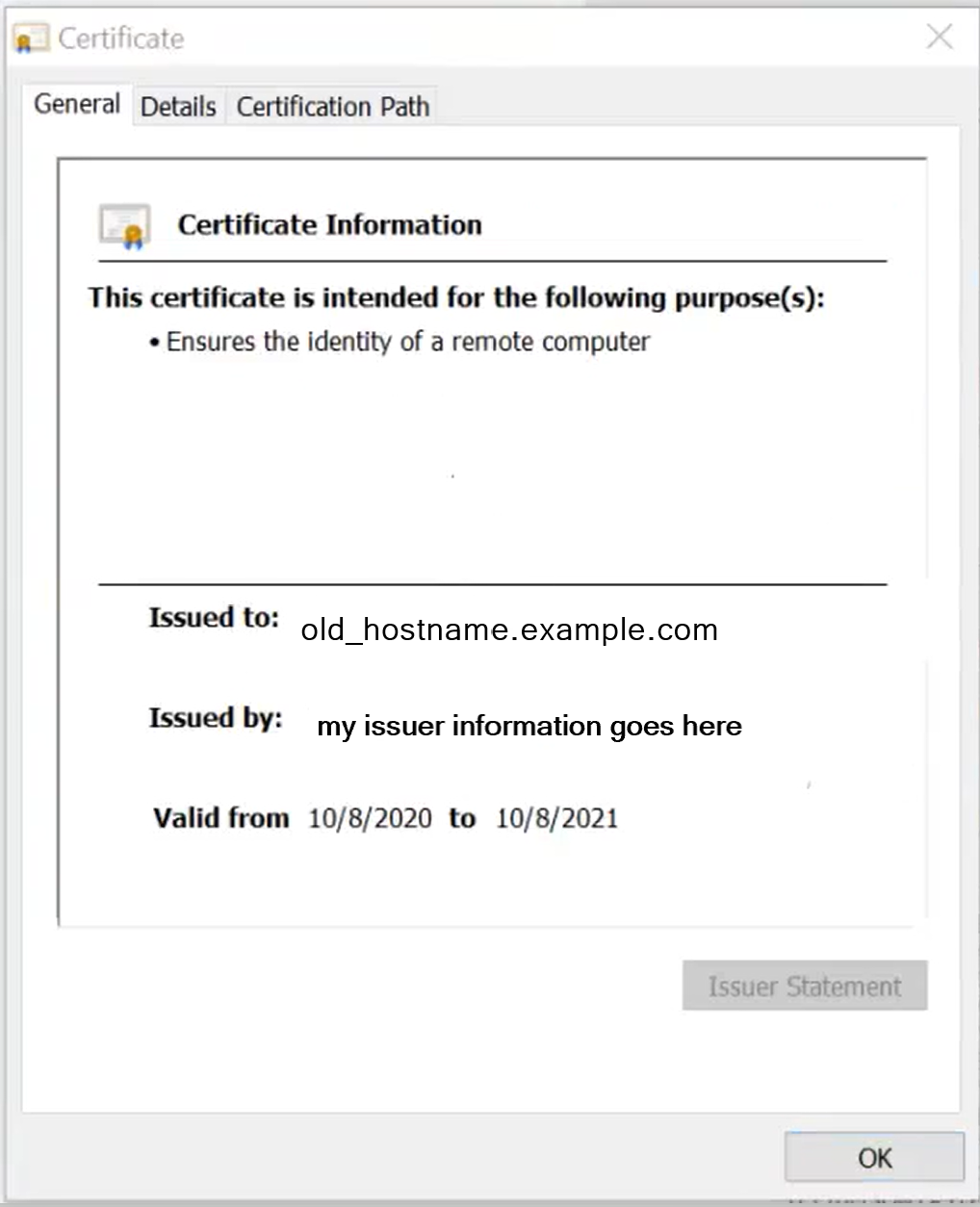 In this instance, looking at the certificate that is causing the error, we found that the 'Subject' hostname belonged to an older system, which was decommissioned as part of the environment upgrade.