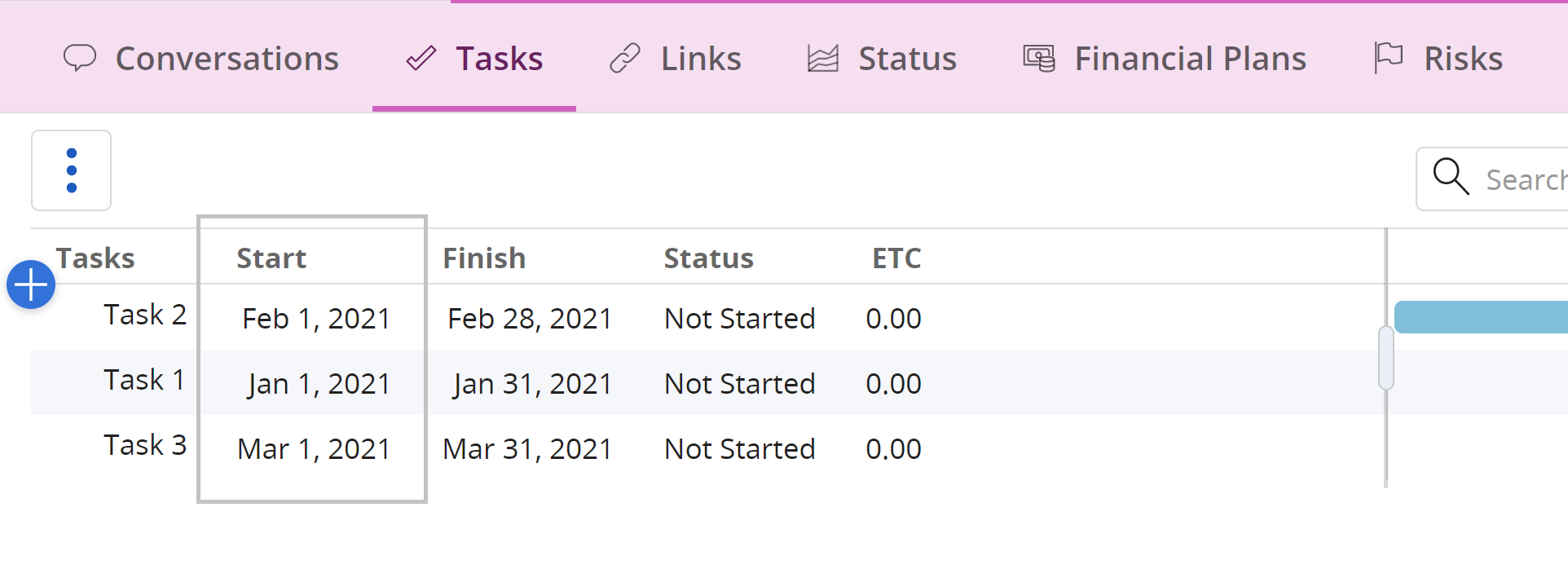 Therefore, the Tasks Timeline view shows the exact order in which Tasks appear in PPM Gantt. Changing the order in PPM Gantt will result in order of Tasks changing in Tasks Timeline view as well.