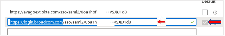 After change the updated field should look like following for this example SP ID: https://login.broadcom.com/sso/saml2/0oa1dqivx15iBsjgp1d8