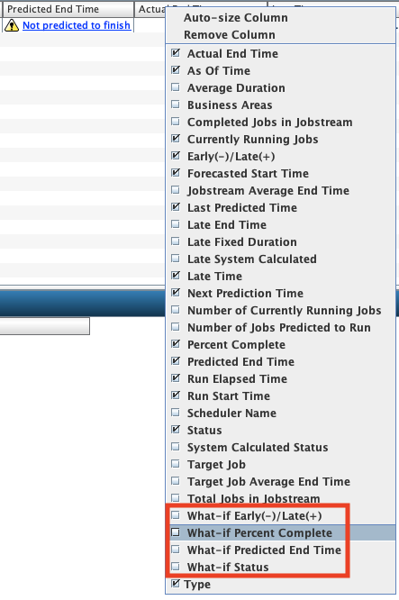 4. Go to the monitoring tab and if you have a job in progress in a NPTF state (Not Predicted to Finish), right click the column headers and you will see several "What if" column headers you can now add like below: