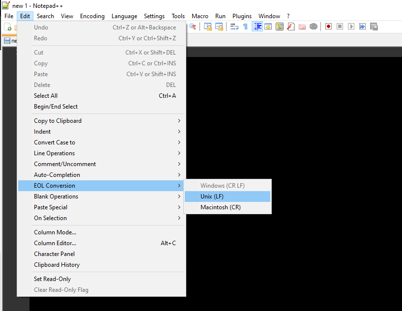 Go to the Edit menu, select EOL Conversion, Select Unix (LF).