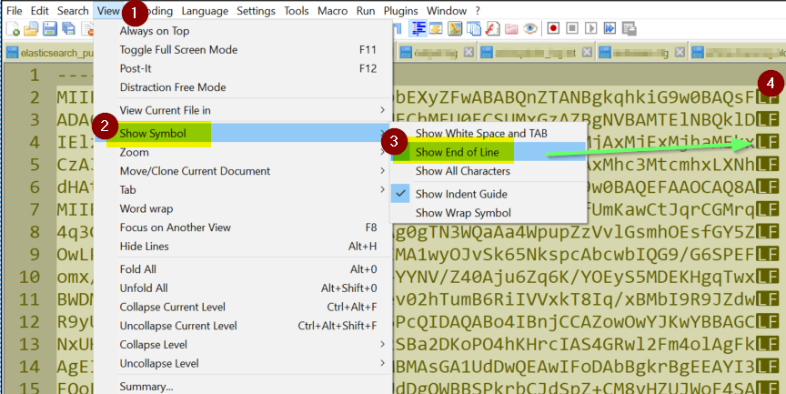 To determine if an existing certificate has hidden characters you can find out from Notepad ++ By opening the .crt and selecting 1. View > 2. Show Symbol> 3. Show End of Line Line Feed (LF) is normal Unix formatting and Carriage Return Line Feed is shows that Windows saved and edited the file format