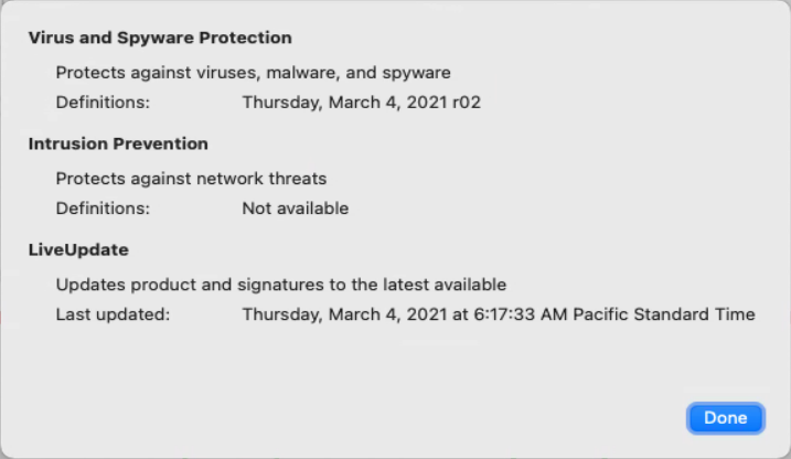 Customize->Activity->Definition Status will display up-to-date Virus and Spyware Protection and LiveUpdate status but Intrusion Prevention definitions status will be "Not available"