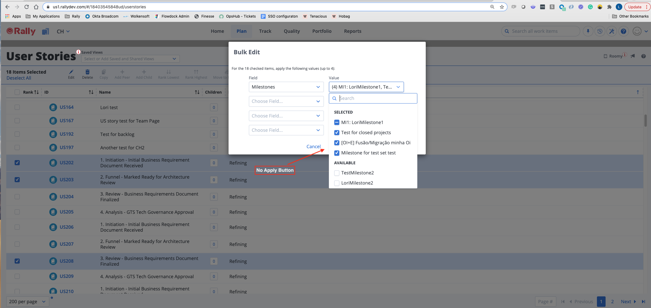 Rally - Annoying behavior on a Bulk Edit on the User Stories and Defects page