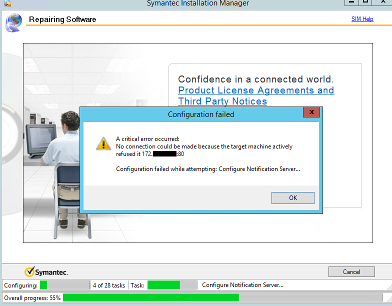 ConfigureNS - task_Completed(): Configuration Task Configure Notification Server... Failed: Unable to connect to the remote serverUnable to connect to the remote server [System.Net.WebException @ System] at System.Net.HttpWebRequest.GetRequestStream(TransportContext& context) at System.Net.HttpWebRequest.GetRequestStream() at System.Web.Services.Protocols.SoapHttpClientProtocol.Invoke(String methodName, Object[] parameters) at Altiris.NS.Installation.ProductConfigurationWebServiceProxy.ConfigureProductBatchForUpgradeWithoutSQL(String[] paths) at Symantec.Installation.UpgradeConfigTask.<StartImpl>d__2.MoveNext()--- End of stack trace from previous location where exception was thrown --- at System.Runtime.CompilerServices.TaskAwaiter.ThrowForNonSuccess(Task task) at System.Runtime.CompilerServices.TaskAwaiter.HandleNonSuccessAndDebuggerNotification(Task task) at Symantec.Installation.NSConfiguration.Tasks.SerialTask.<Start>d__0.MoveNext()
