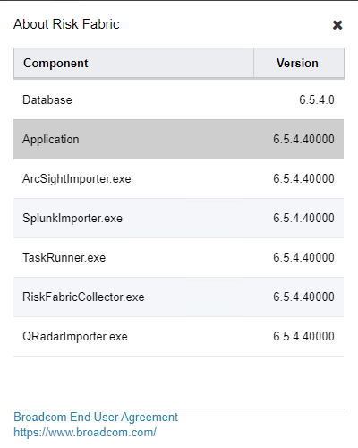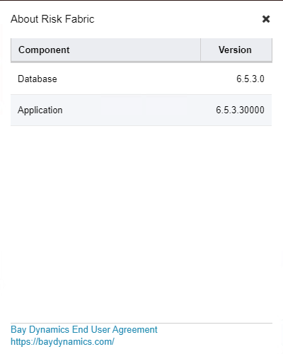 Clicking on the product version displayed in the lower left-hand corner of the ICA console brings up the About Risk Fabric window: